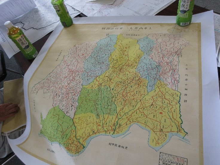 各区の委員さんが昔のことを思い出しながら、併せて、長老に尋ねながら、現在の地図上に古道(赤線)を記入していきます。