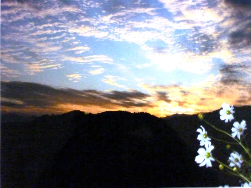 夕日が沈み空が明るくなり コスモスを入れて見ました。