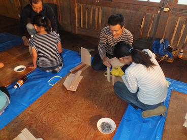 生憎の雨降りにつき青竹炊飯体験は中止し、分校の教室で本立て作りです