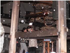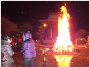 清めの雪が舞う中、笠井 雅裕 ご住職の読経に続き、お守りいただいたお札・お守りのお焚きあげ。