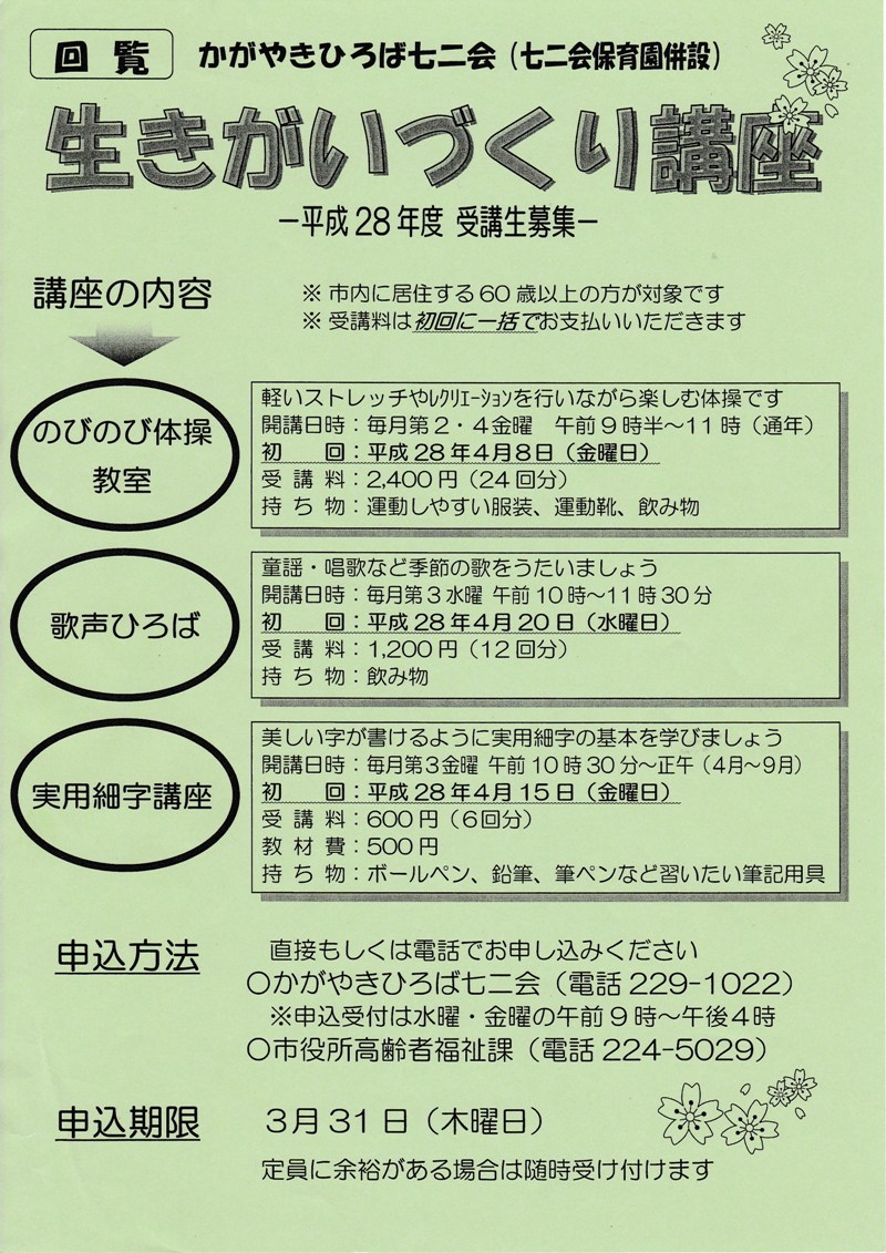 3月31日(木曜日) 定員に余裕がある場合は随時受け付けます