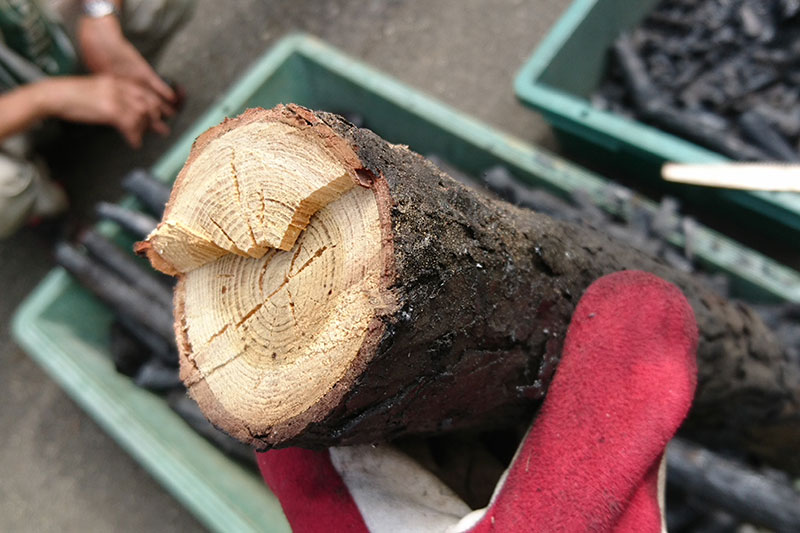 8月4日塩尻林業センターの研修で作ってみました。割ったところ。上手く中まで黒くなっています。