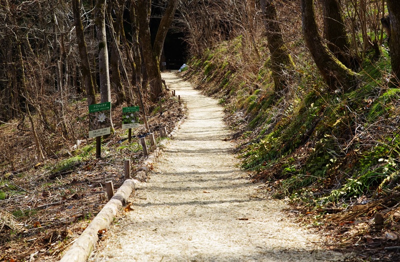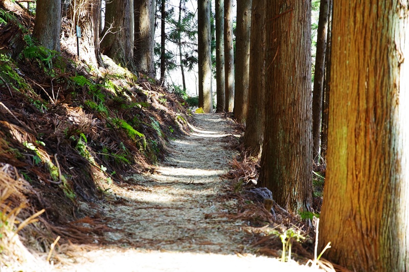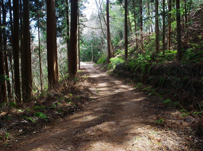 舗装された杉林の歩道を歩き、舗装が切れた所から竹チップを厚く引き詰めた歩道になりました。