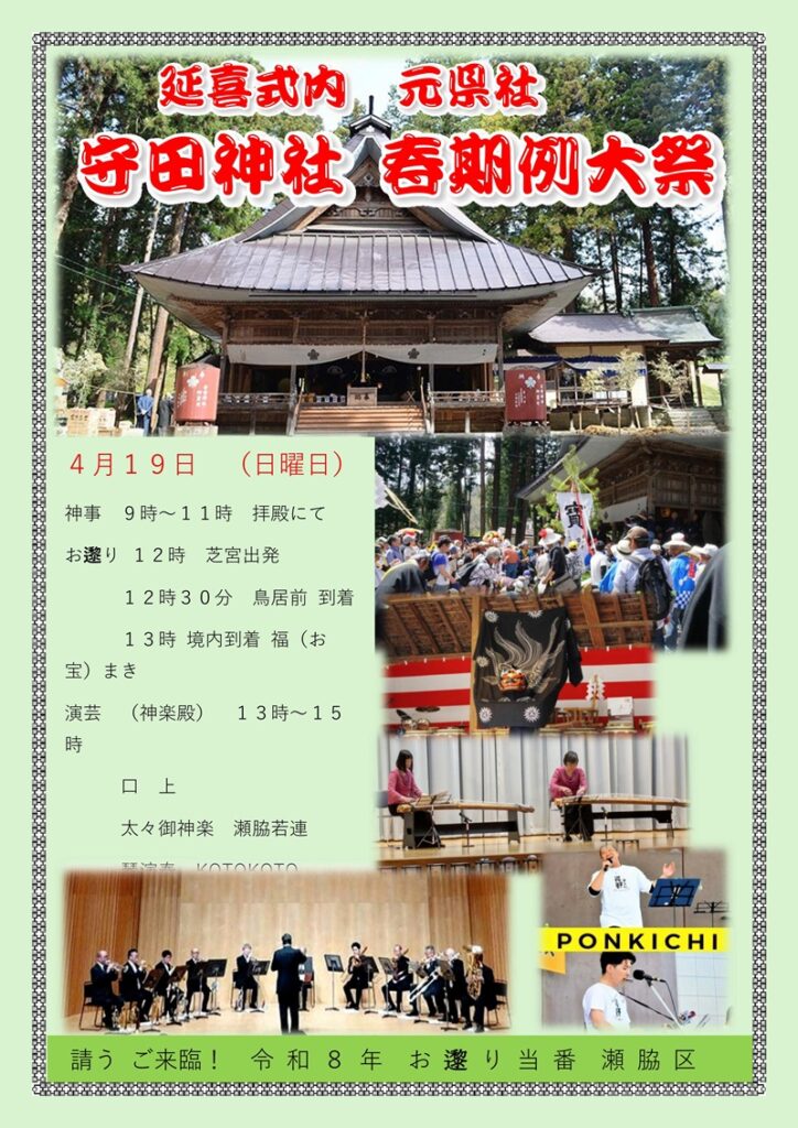長野市七二会古間地区に鎮座する 延喜式内 守田神社の春期例大祭が開催されます